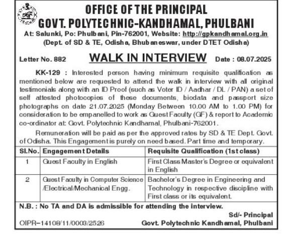 Government Polytechnic, Kandhamal, is dedicated to fostering a vibrant academic atmosphere that nurtures holistic development. We believe in actively involving students in qualitative processes to prepare them as future leaders and change-makers of society. The institution emphasizes building an innovative ecosystem that hones skills across diverse programs, ensuring students excel both academically and in the global industrial landscape. Our primary mission is to empower students with knowledge, wisdom, experience, and practical training in engineering. Through value-based, activity-oriented education, we aim to produce well-rounded professionals capable of meeting the challenges of a competitive world. To achieve this, we focus on creating an enriching and enjoyable learning environment where curiosity and enthusiasm are continually nurtured. Our multidisciplinary approach to teaching combines theory with hands-on practice, making education engaging and impactful. At Government Polytechnic, Kandhamal, we strive to identify and develop the untapped potential of our students, shaping them into champions equipped with enduring knowledge and skills to overcome global challenges.