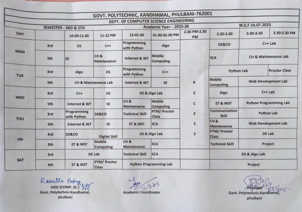 The Department of Computer Science at GOVT. Polytechnic Kandhamal, Phulbani has been started in the year of 2023. The Computer Science department is dedicated to fostering innovation and excellence in the ever-evolving field of technology. Our programs provide a solid foundation in Computer Science principles, along with hands-on experience in areas such as Software Development, Data Structures, Algorithms, And Artificial Intelligence. With a team of experienced faculty, state-of-the-art laboratories, and a curriculum that is continuously updated to reflect the latest industry trends, we aim to equip students with the skills needed to excel in both academia and the tech industry. Our department encourages a culture of creativity, collaboration, and problem-solving, preparing students to tackle the challenges of the digital age and make meaningful contributions to the world of technology.